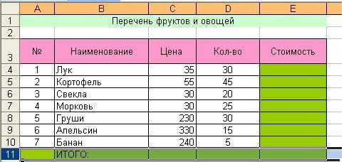 В этом документе вместе с преподавателем учащиеся записывают формулу расчета стоимости = С4*D4, в ходе работы учащиеся знакомятся с новым инструментом для копирования формул