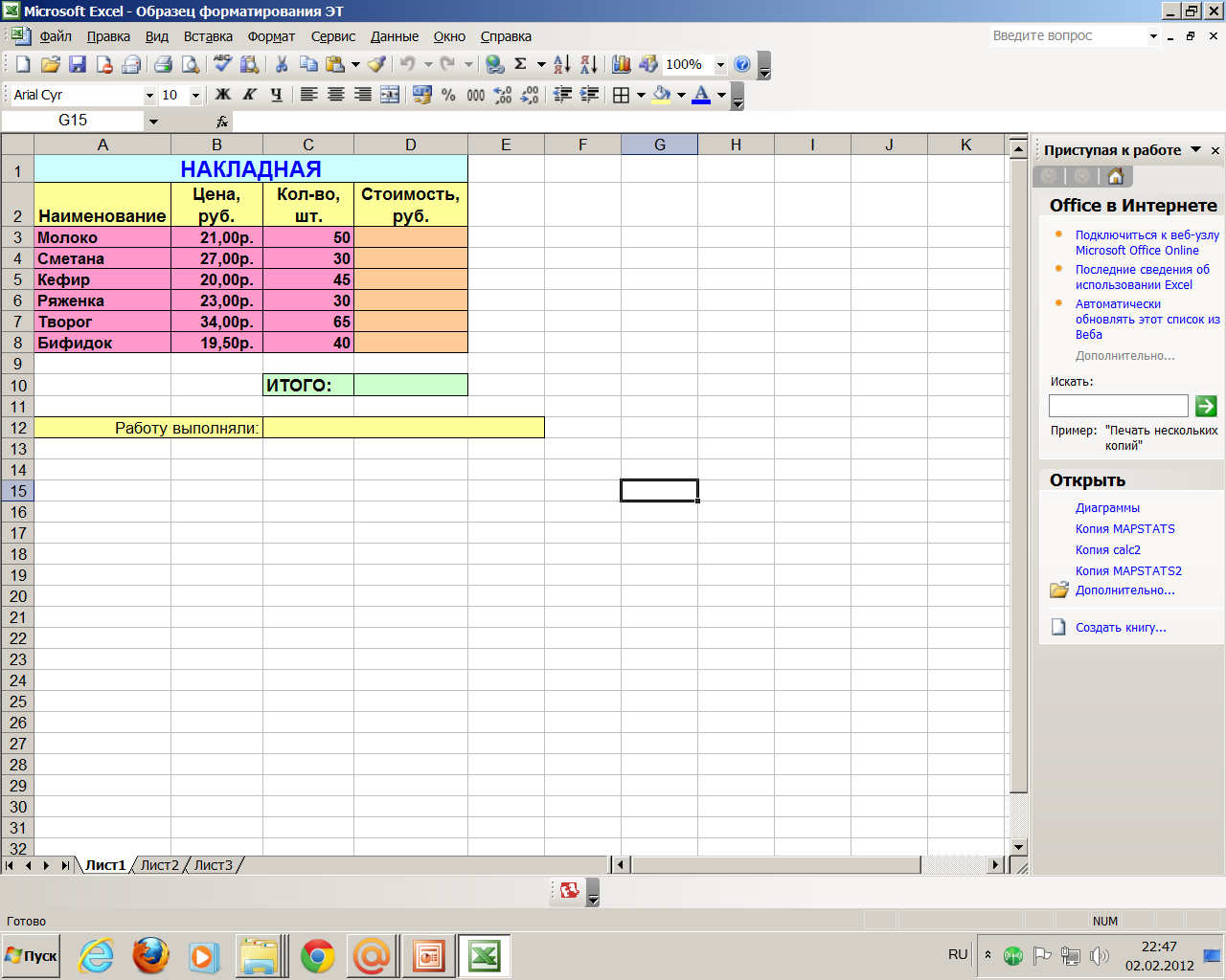 Образец отформатированной ЭТ: