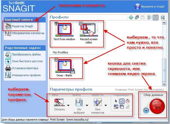 Основное назначение программы - снятие скриншотов с экрана монитора, причем SnagIt умеет делать не, только статичные графические снимки выбранной области, но и, например, позволяет записать в видео-файл то, что происходит на экране.