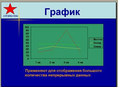 Табличный процессор MS Excel позволяет построить 14 стандартных видов диаграмм. Из них наиболее часто применяют три вида:• График (показ слайда );