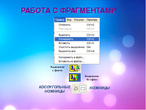 выделять фрагменты разными способами; копировать фрагмент;