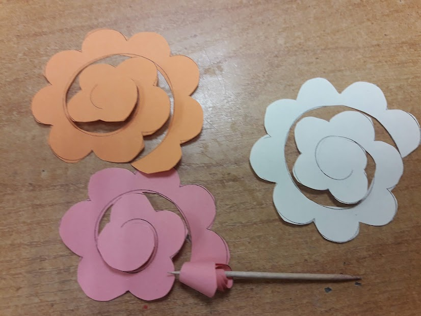Оформление лицевой части. Выбрать 1-2 напечатанные на цветной бумаге поздравления или картинок к Дню матери, вырезать. Затем вырезать по 3 плоских и объемных цветов, напечатанных на принтере на цветной бумаге. Плоские цветы вырезать по контуру и слегка подкрутить края лепестков. Заготовку объемного цветка вырезать и накрутить на зубочистку по спирали, снять с зубочистки. Объемные цветы приклеить в центр плоских цветов. На лицевой части открытки красиво расположить надписи и цветы, приклеить.