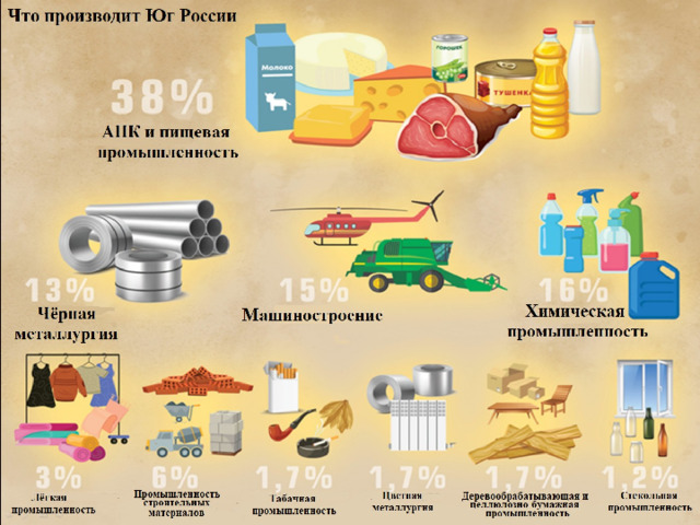 Промышленными центрами стали Ростов-на-Дону, Новочеркасск, Таганрог, Краснодар, Волгодонск . Здесь работают заводы по выпуску техники для сельского хозяйства, проектируется и производится оборудование, станки для пищевой и нефтегазовой промышленности.