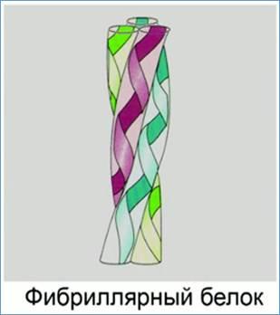 Фибриллярные белки представляют собой длинные параллельные полипептидные цепи, скреплённые друг с другом поперечными сшивками, образуют длинные волокна, или слоистые структуры (Рис. 1).
