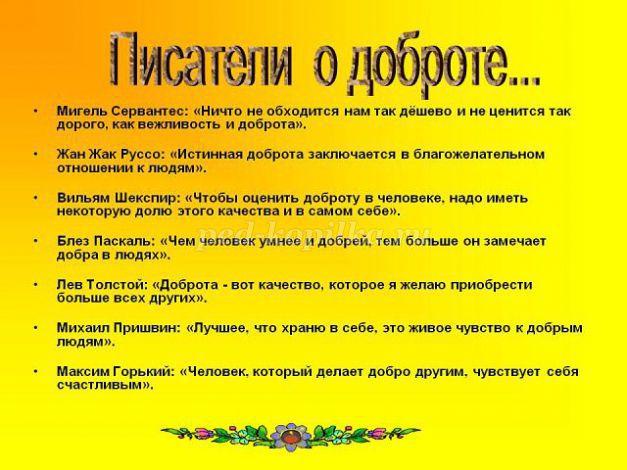 Воспитатель: многие писатели, ученые много писали замечательных строк о доброте. Послушайте некоторые из них.