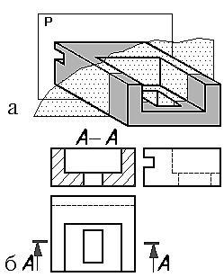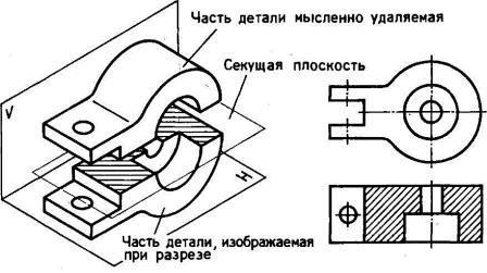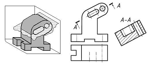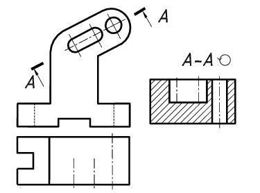 Если секущая плоскость совпадает с плоскостью симметрии предмета, а разрез выполнен на месте соответствующего вида в проекционной связи и не разделен каким-либо другим изображением, то для горизонтальных, вертикальных и профильных разрезов отмечать положение секущей плоскости не нужно и разрез над Простые наклонные разрезы и сложные разрезы обозначают всегда.