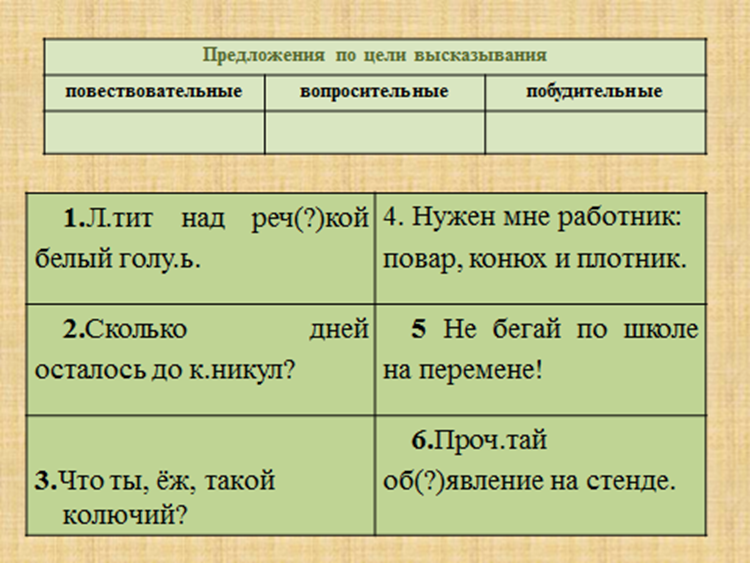 - умение определять вид предложения по цели высказывания; правильно оформлять предложения на письме;