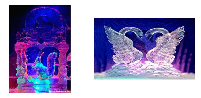 Эти скульптуры выточены изо льда. А чтобы они стали прозрачными ледяную поверхность скульптур расплавляют.