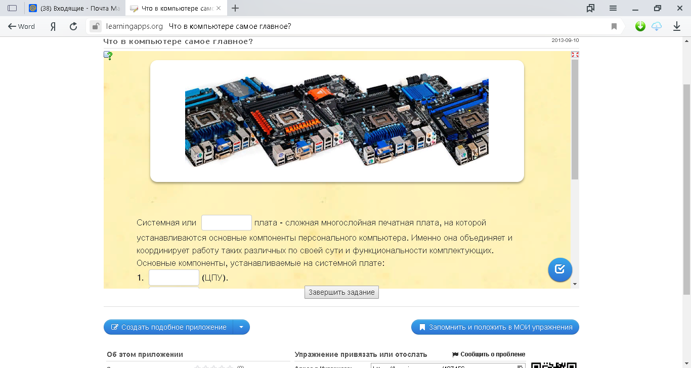 Главным в этом наборе компьютера является системный блок, в котором находится «мозг» машины: микропроцессор и внутренняя память (учебник с.42-43).