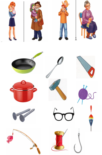 Материалы: картинки с изображением членов семьи, предметов быта: сковорода, ложка, кастрюля, пила, молоток, гвоздь, очки, моток ниток для вязания, удочка, поплавок, рыболовный крючок.