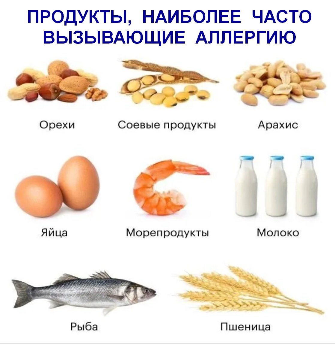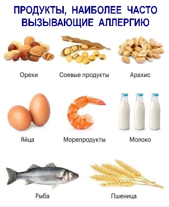 в продуктах – орехи (арахис, лесные орехи), яйца, молоко и молочные продукты, пшеница, соя, рыба, морепродукты