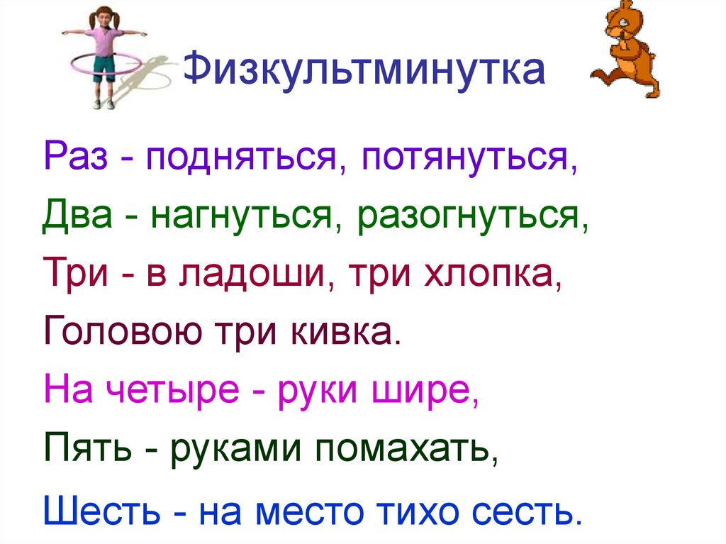 Учитель: Будем отдыхать. Встань. Повторяй за мной.