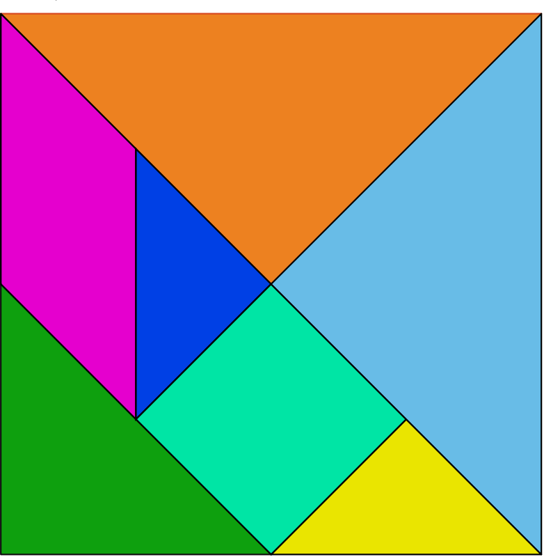 «Танграм»- одна из несложных игр. Называют её и «Головоломкой из картона», «Геометрическим конструктором». Квадрат размером 8 на 8 см из картона, одинаково окрашенного с обеих сторон, разрезают на 7 частей. В результате получается 2 больших, 1 средний и 2 маленьких треугольника, квадрат и параллелограмм. Используя все 7 частей, плотно присоединяя их одну к другой, можно составить много различных изображений по образцам или по собственному замыслу.