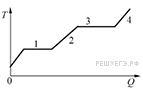 2. В цилиндре под поршнем находится твёрдое вещество. Цилиндр поместили в раскалённую печь. На рисунке показан график изменения температуры Т вещества по мере поглощения им количества теплоты Q. Какие участки графика соответствуют плавлению вещества и нагреванию вещества в газообразном состоянии? Установите соответствие между тепловыми процессами и участками графика.