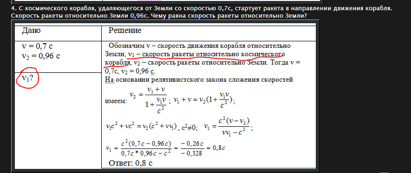 12. С космического корабля, удаляющегося от Земли со скоростью 0,75 с, стартует ракета в направлении движения корабля. Скорость ракеты относительно Земли 0,96 с. Какова скорость ракеты относительно корабля?
