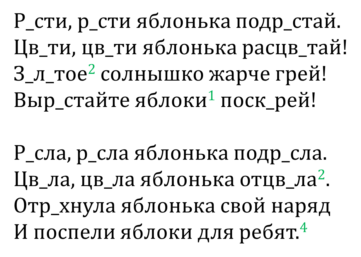 | ление места затруднения | их в новых ситуациях. Создание проблемной ситуации, эвристическая беседа, обучающая игра. | – Объясните свой выбор. (В первом ряду есть одно слово с чередующейся гласной в корне слова, во втором ряду лишним будет слово с проверяемой безударной гласной.) – В корнях с чередующимися гласными Выделить корень Есть ли суффикс -А- после корня Сделать вывод I вариант II вариант Распол..гаться на берегу предпол..жить ответ легкое прик…сновение прик…саться осторожно к…снуться рукой прил…гать усилия Лексическое значение корней -раст-, -ращ-, -рос- - развитие Подро’стки « Угадай слово» Увеличиваться в росте расти; Молодой побег растения росток; Мальчик или девочка в возрасте от 12 до 14 лет подросток; Количество лет кому-либо возраст; Отдельная область науки, производства отрасль Пальчиковая гимнастика | у них недостаточно для полных ответов. |