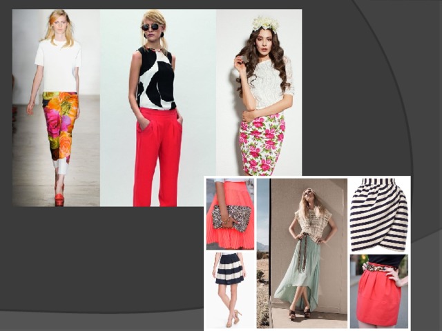 - Делаем акцент на бедрах. Яркие брюки и юбки, включайте в сой гардероб разнообразные принты, в особенности полоску горизонтальную.