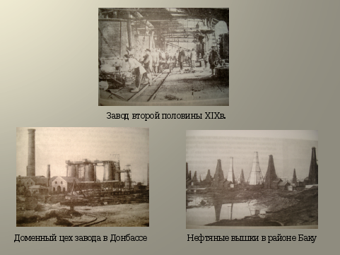 Ребята, (РАБОТА СО СЛАЙДОМ) обратите внимание, во 2 половине 19 века завершился промышленный переворот, строились новые заводы, шахты, нефтяные вышки.