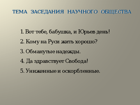 Рефлексия. Ребята, а теперь обратите внимание на лист с вариантами тем Заседания Научного общества. Мы рассмотрели с вами основные положения реформы, как вы считаете какое название отражает ее суть, выберите из предложенных, а, может быть, у вас будет свой вариант?