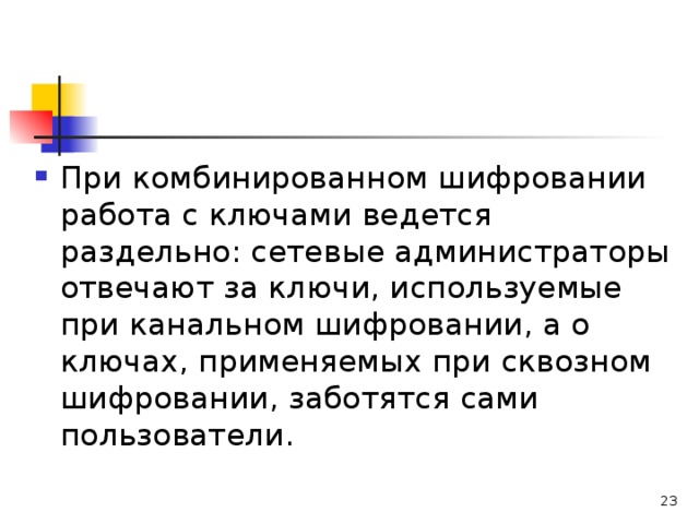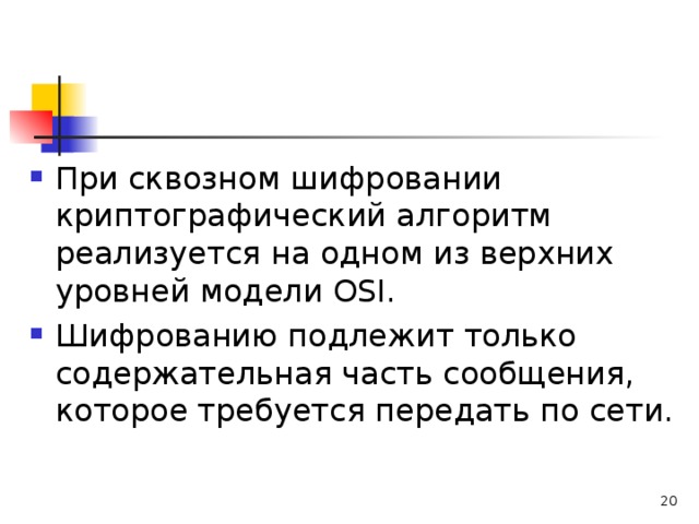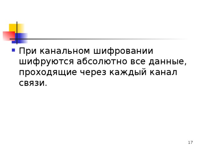 - Стоимость реализации канального шифрования в больших сетях может оказаться чрезмерно велика.