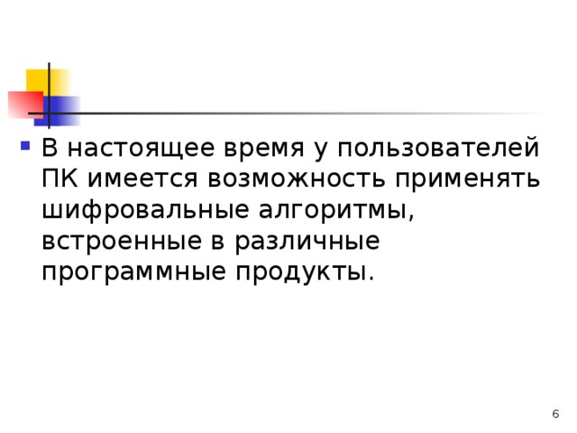 - скорость шифрования файлов должна соответствовать скоростям, на которых работают устройства ввода/вывода современных компьютеров;