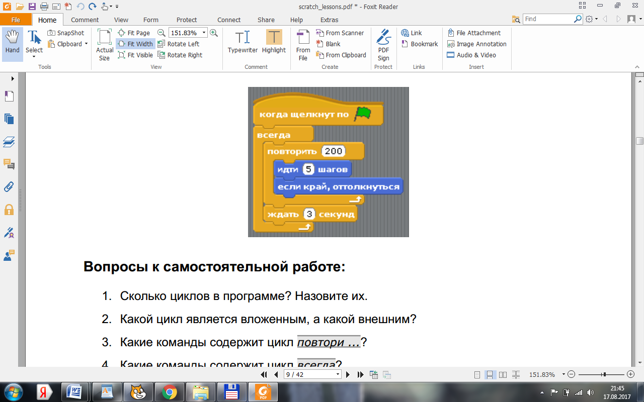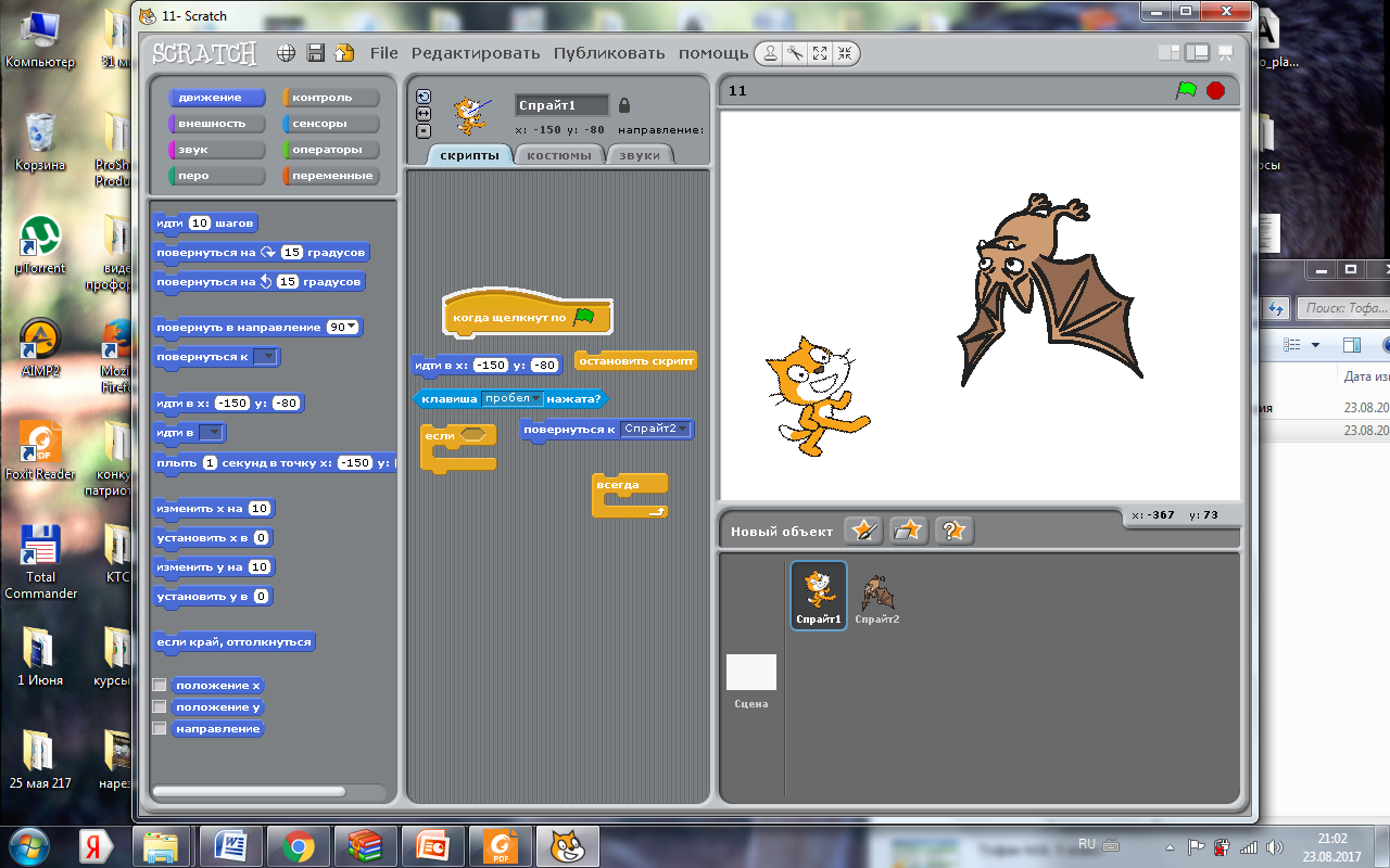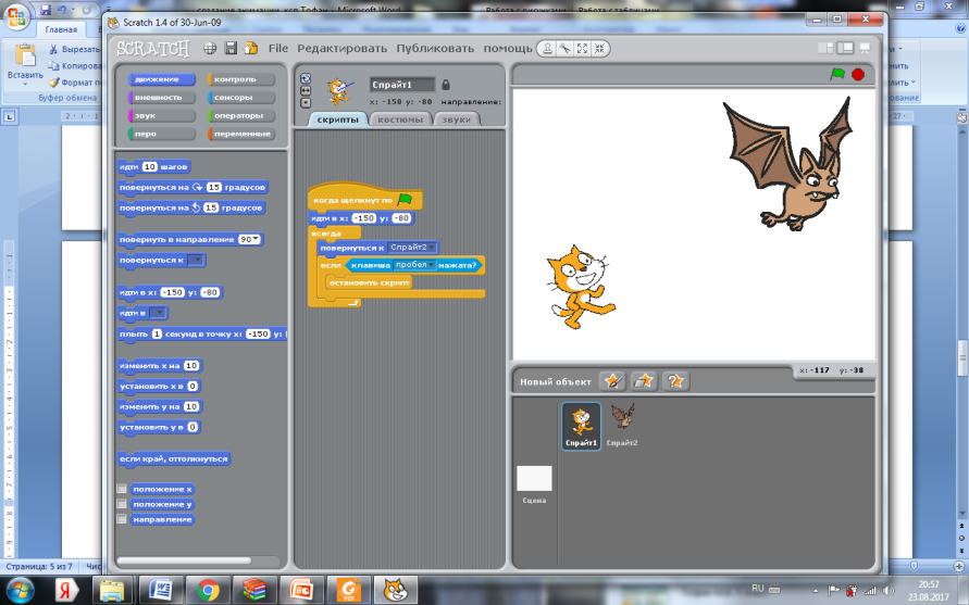 Кликните два раза по Спрайту 1, и в области Скрипты составьте программу, в которой кот идет слева направо до конца, говорит привет, поворачивается на 90 градусов, ждет 3 секунды, возвращается назад, превращается в летучую мышь (меняет костюм) и летит по диагонали, спрашивает в конце «Все понятно?».