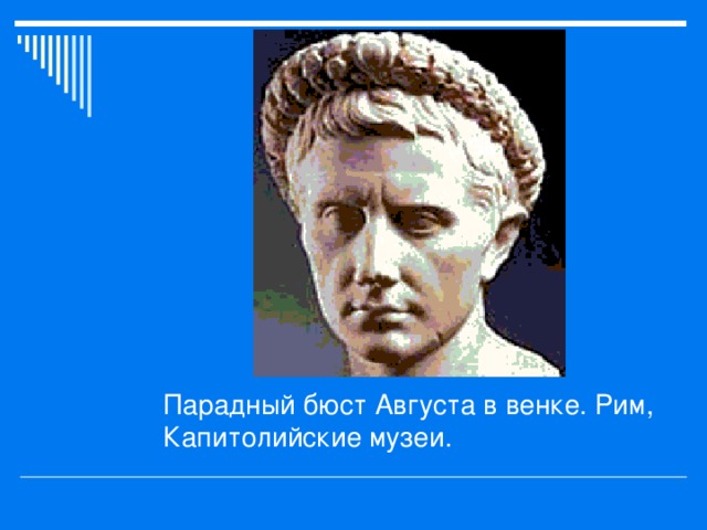 - Статуя Августа в образе бога Юпитера. 1 н.э. Искусство эпохи Августа ориентировалось на греческую классику и было направлено на представление Рима величественной и нерушимой империей.