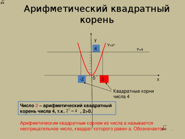 0. Арифметическим квадратным корнем из числа а называется неотрицательное число, квадрат которого равен а. Обозначается . " width="640"