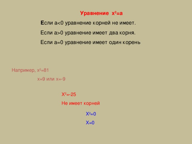 0 уравнение имеет два корня. Если а=0 уравнение имеет один корень Например, х 2 =81 х=9 или х=-9 Х 2 =-25 Не имеет корней Х 2 =0 Х=0 " width="640"