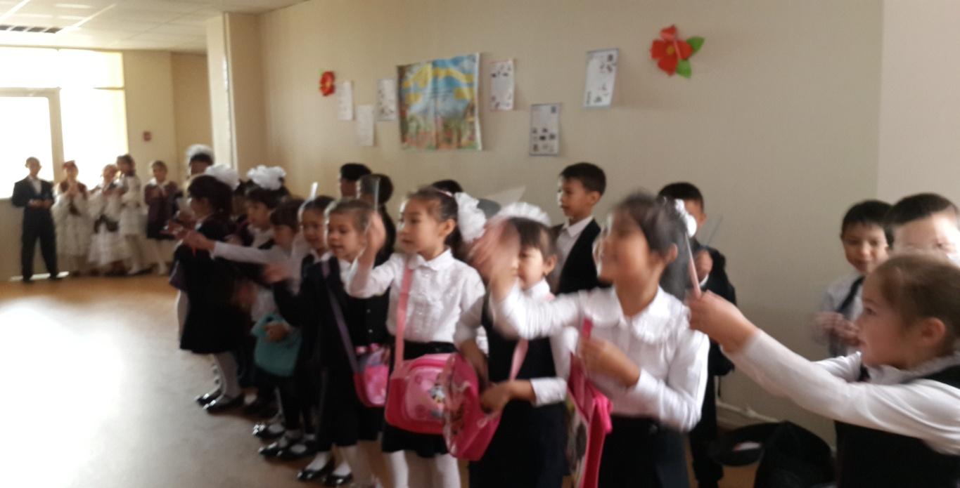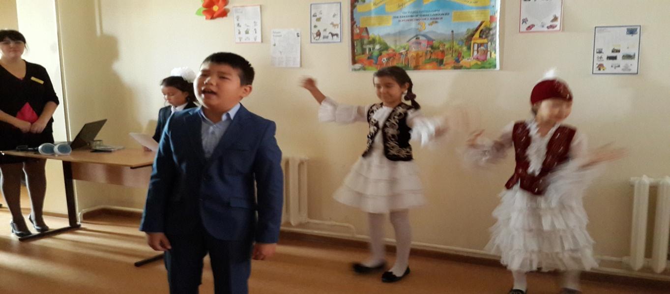 1-жүр: Наша школа, как и наша республика – одно многонациональное государство. Здесь учатся дети разных национальностей: казахи, русские, курды, уйгуры, немцы, узбеки. Все они на основе проводимой нашим президентом национальной политики развивают свой язык, национальную культуру. We welcome to the stage the boys of 4a, 3a grades with Kazakh national dance