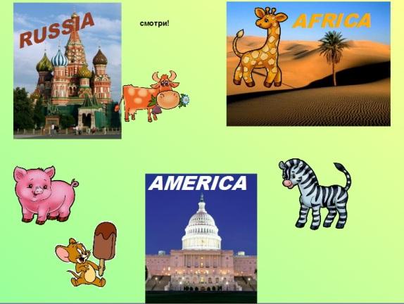 | Использована функция «контейнер» - Жираф запрограммирован только на контейнер “Africa”, поэтому при помещении его в контейнер “America” или “Russia” он не остается там и дает возможность учителю отработать различные утвердительные или отрицательные структуры. Таким же образом запрограммированы остальные герои флипчарта. |