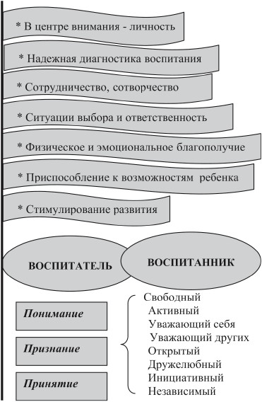 Личностно-ориентированное воспитание – это такая воспитательная система, где ребенок является высшей ценностью, ставится в центр воспитательного процесса, основанного на принципах гуманистической педагогики: самоценность личности, уважение к ней, природосообразность воспитания, добро и ласка, учет особенностей индивидуального развития, отношение к ребенку как полноправному, ответственному участнику воспитательного процесса, который осознает свое собственное достоинство, уважает достоинство и свободу других (рис. 14).
