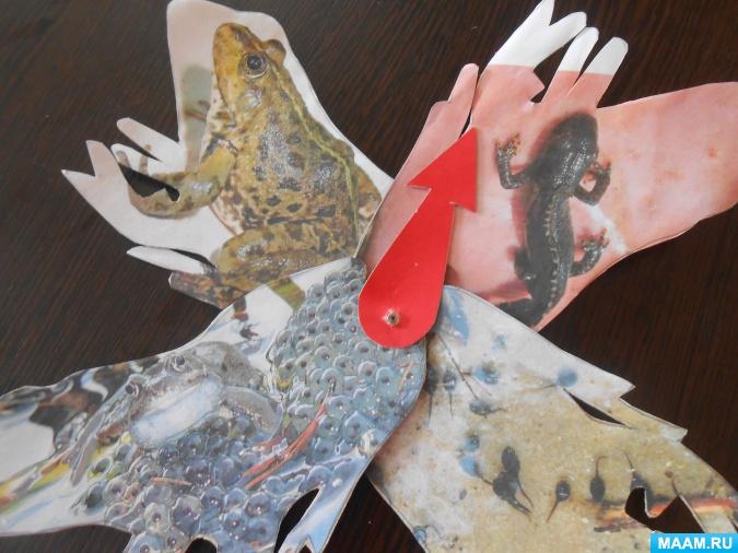 Воспитатель: В весенний период лягушка отыскивает тихие уголки у самого берега реки или маленького озера, на мелководье. Самка откладывает определенное количество яиц, икринок. Они соединены в сплошную массу, напоминающую желе, и прикреплены к какому-нибудь растению в водоеме. По желанию предлагаю взять картинки в виде лягушек со стрелкой «Периоды размножения». Данный материал необходимо расправить веером и перемещать стрелку по периодам размножения животного от икринки до взрослой особи.