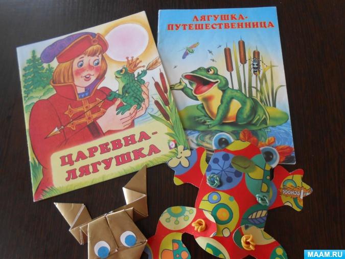 (Стеклянную, Голиаф, Арлекин, Пурпурную). Яркость окраса этой лягушки, что подсказывает вам? Какое, название вы ей придумали? Краткое знакомство проходит по кармашку «Мировые лягушки». Наша лягушка настоящая «Сказочная героиня», о ней много сложено стихов, загадок, по некоторым ее повадкам в народе предсказывали погоду. Сейчас назовите названия рассказов и сказок о лягушке (приложены книги: «Царевна – Лягушка», «Почему у лягушки нет хвоста», «Лягушка – путешественница» и др.) Молодцы!