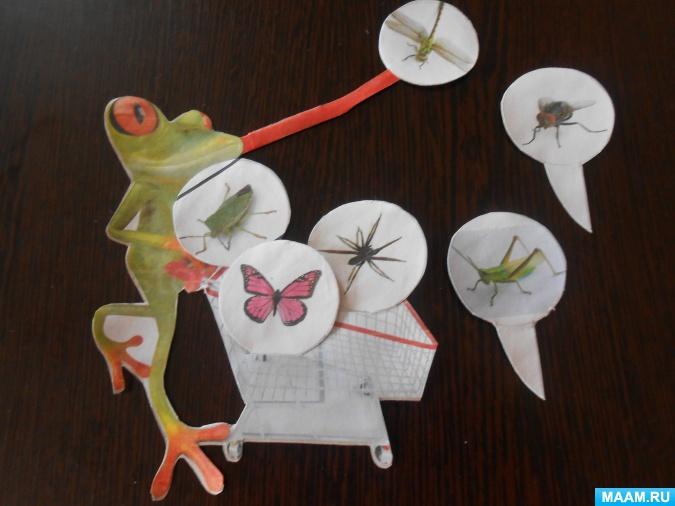 Привлекаю внимание детей плоскостной картинкой - лягушка с продуктовой тележкой. Ребята, куда собралась наша «хозяйка», как вы думаете? Какие она продукты закупила? Перечислите лакомство нашей героини? Даша вставит в прорези тележки имеющие у нас «Любимые блюда» - бабочку, кузнечика, муху, клопа и др. С продуктовой тележкой мы немного пошутили. А сейчас ответьте на вопрос: чем еще питается лягушка? Что вы знаете о способе ловли насекомых?