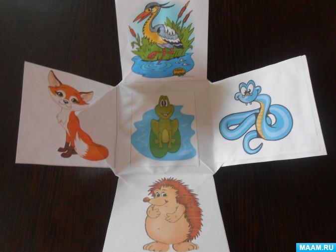 У лягушки есть свои враги, как у каждого животного. Переходим к окошечку «Кого боится лягушка?» Предлагаю ребенку взять модель окошечка и провести показом некоторых животных, кого она боится. Почему? Ребята, как вы думаете, лягушки обитают только в нашей стране? Передаю детям на просмотр книжечку – гармошку с изображением лягушек из некоторых частей света. Рассматриваем лягушку – Помидор