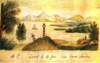 Своё первое восхищение красотой Кавказа Лермонтов передаст в детском рисунке акварелью, подписанном на французском языке "М.Л. 1825 год. 13 июня. На Горячих водах". Горы на рисунке по силуэту напоминают Бештау и Машук, у их подножия огромное озеро и лодка под парусом. Символично, что именно у одной из этих гор встретит свой последний час поэт.