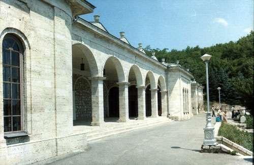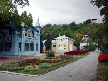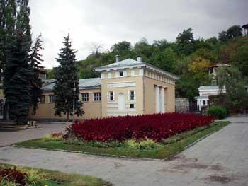 Справа от Академической галереи – курортный городок. По дороге к нему привлекает внимание высокое, легкое, как будто высвеченное из облака, здание серных ванн с бьющими из-под скалы целебными источниками. Это второй по мощности в Пятигорске углекислый сероводородный источник, дающий 500 тысяч литров «живой воды» в сутки.