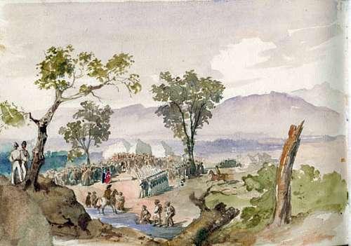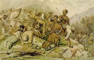 Эпизод сражения при Валерике 11 июля 1840 г. Акварель М.Ю. Лермонтова и Г.Г. Гагарина. Лермонтов выполнил рисунок композиции, а Гагарин дописал его акварелью. Этот рисунок обнаруживает в Лермонтове блестящего рисовальщика и баталиста. Война изображена им во всём её драматизме, без прикрас.