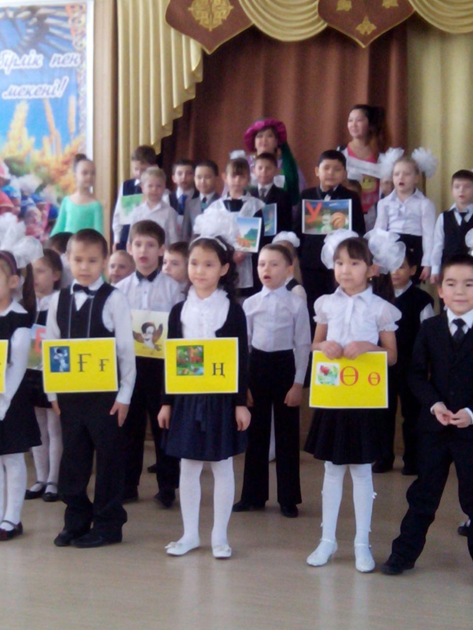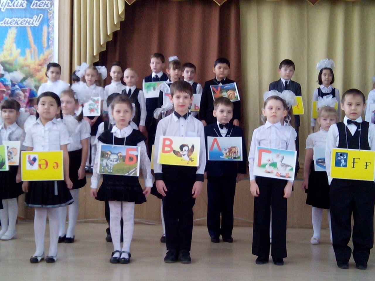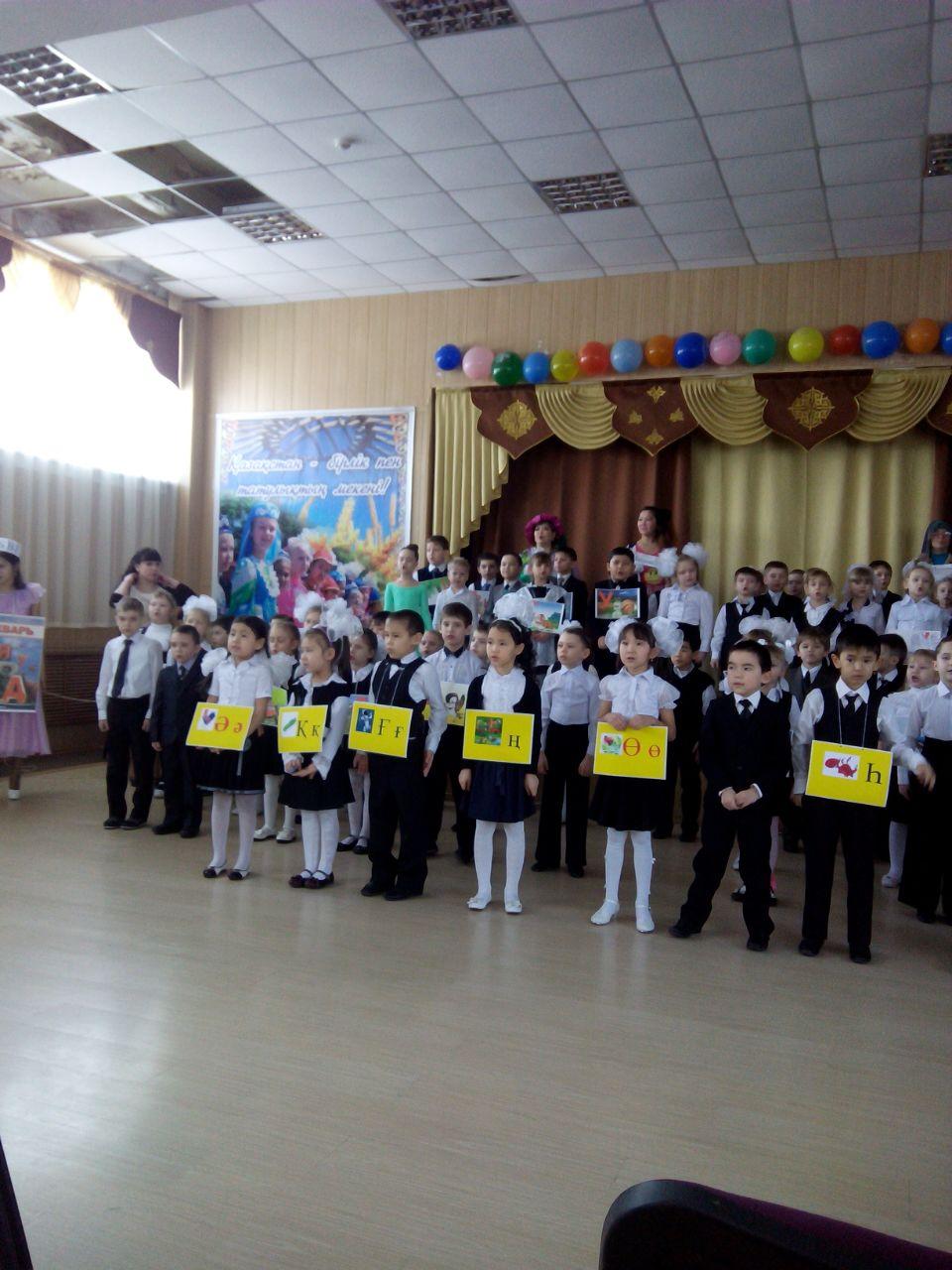 Учитель: Сәлеметсіздер ме, оқушылар, ата-аналар және қүрметті қонақтар! Бүгінгі біздің мерей-тойымыз әліппемен қоштасуға арналады.