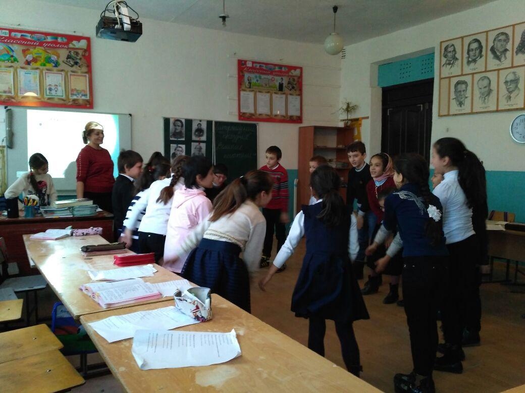 Учитель. Знаете ли вы, как граф Толстой играл со своими учениками? Давайте мы сейчас в нее поиграем. Вставайте в круг. Я показываю движения и говорю слова, а вы повторяете