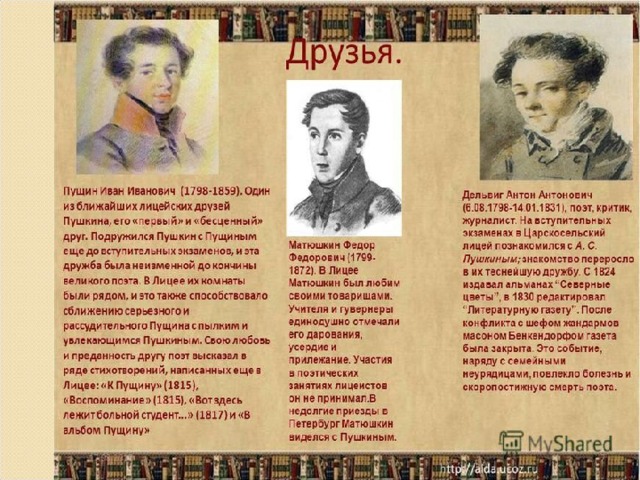 Одним из лучших друзей Пушкина был И.И. Пущин. Именно он поддерживал в трудные минуты поэта .