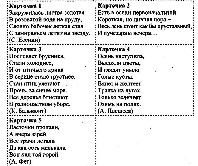 Учитель готовит карточки с отрывками стихотворений, которые изучали в этом разделе. Ученик выходит к доске, выбирает карточку, выразительно читает отрывок стихотворения, называет автора и название стихотворения.