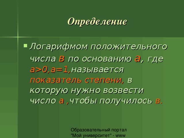 - Логарифмом положительного числа в по основанию а , где а 0,a = 1, называется показатель степени, в которую нужно возвести число а , чтобы получилось в.