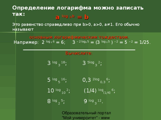 Например: 2 log 2 6 = 6 ; 3 – 2 log 3 5 = (3 log 3 5 ) – 2 = 5 – 2 = 1 /25 .