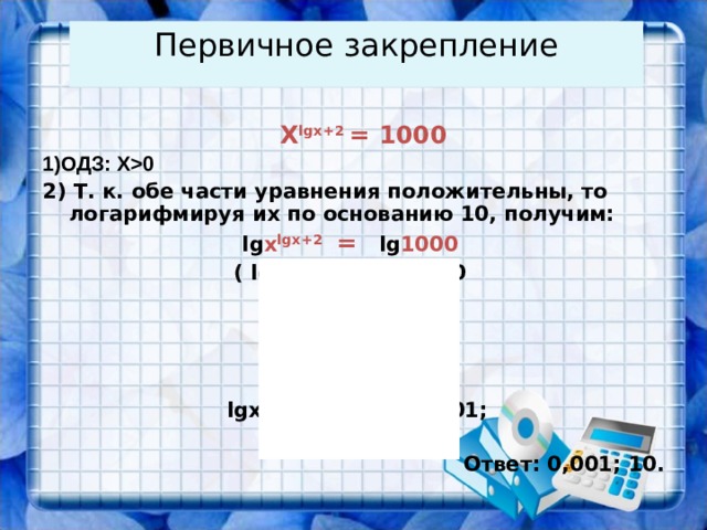 0 2) Т. к. обе части уравнения положительны, то логарифмируя их по основанию 10, получим: lg x lgx+2 = lg 1000 ( lgx+2)·lgx=lg1000 lg 2 x+ 2lgx- 3=0 lgx = y у 2 + 2у- 3=0 y =- 3 , у=1. lgx =- 3 , x =10 -3 =0,001; lgx =1, x =10 Ответ: 0,001; 10. " width="640"