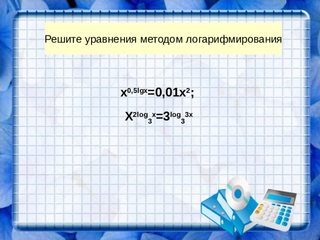 Решите уравнения методом логарифмирования