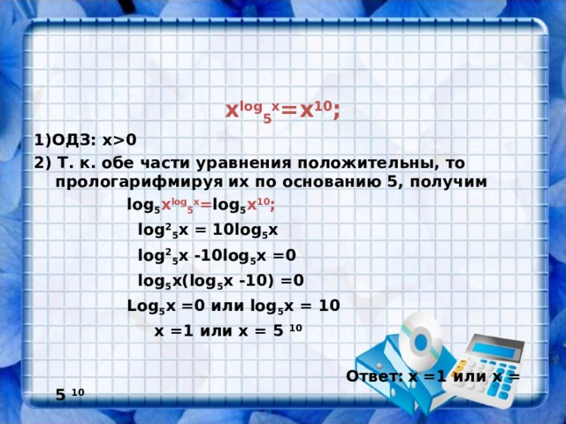0 2) Т. к. обе части уравнения положительны, то прологарифмируя их по основанию 5, получим lоg 5 x lоg 5 x = lоg 5 x 10 ; lоg 2 5 х = 10lоg 5 x lоg 2 5 х -10lоg 5 x =0 lоg 5 x(lоg 5 x -10) =0 Lоg 5 x =0 или lоg 5 x = 10 х =1 или х = 5 10 Ответ : х =1 или х = 5 10 " width="640"