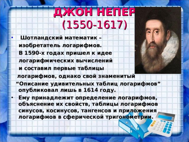 - Ему принадлежит определение логарифмов, объяснение их свойств, таблицы логарифмов синусов, косинусов, тангенсов и приложения логарифмов в сферической тригонометрии.