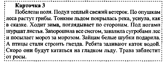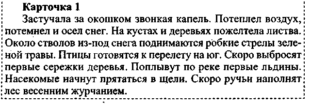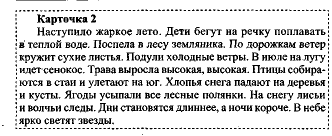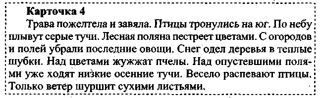 Класс делится на четыре группы. Учитель раздает карточки. На каждой карточке деформированный текст, об одном из времен года. Дети должны выбрать из текста предложения, которые относятся к описанию осени.
